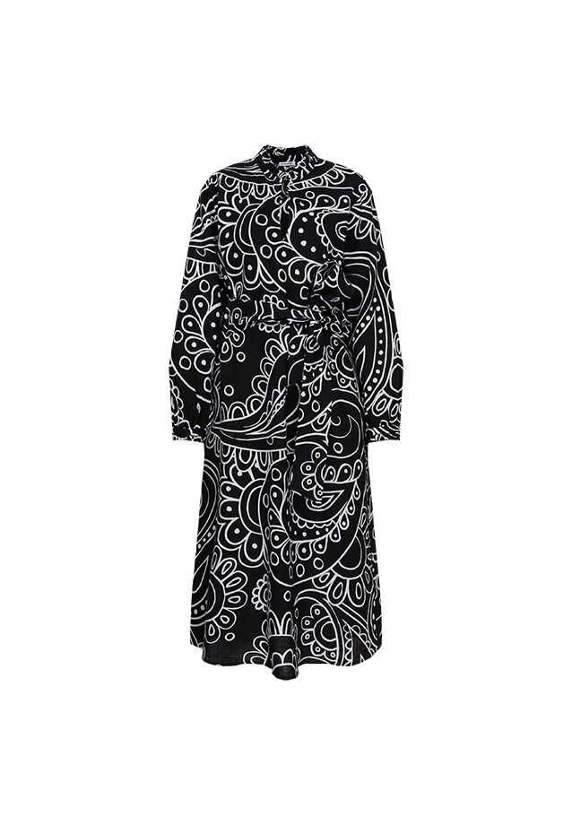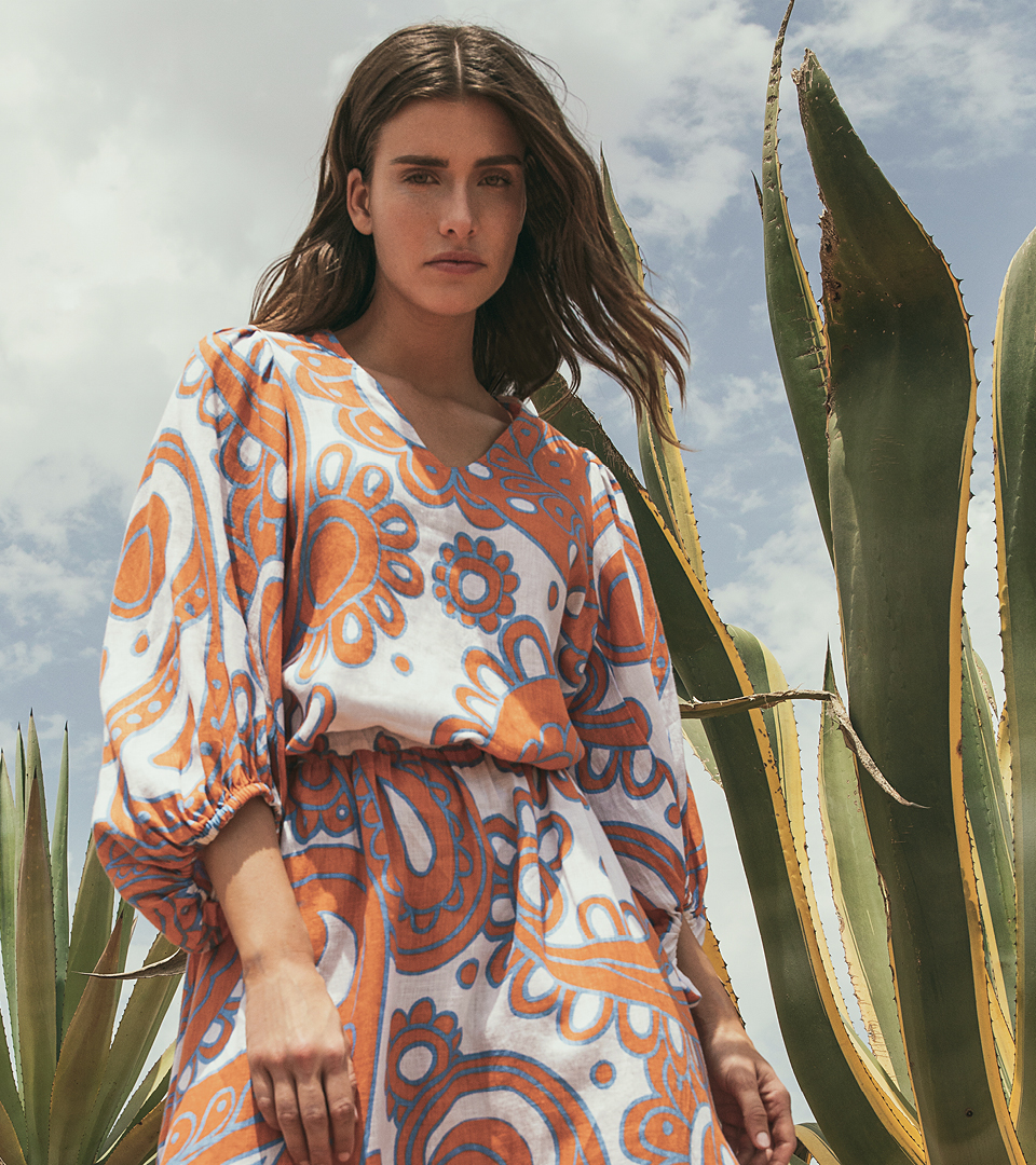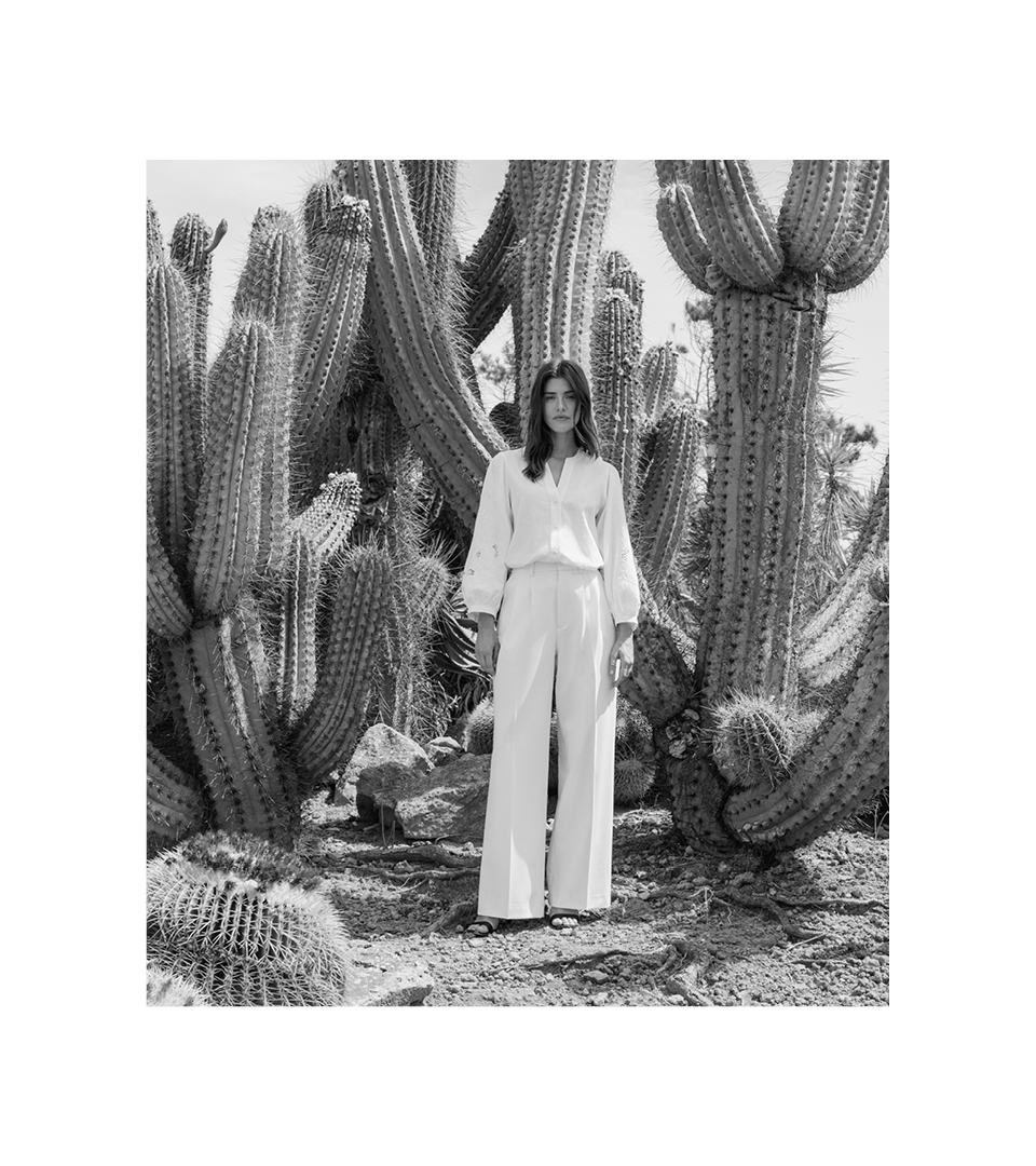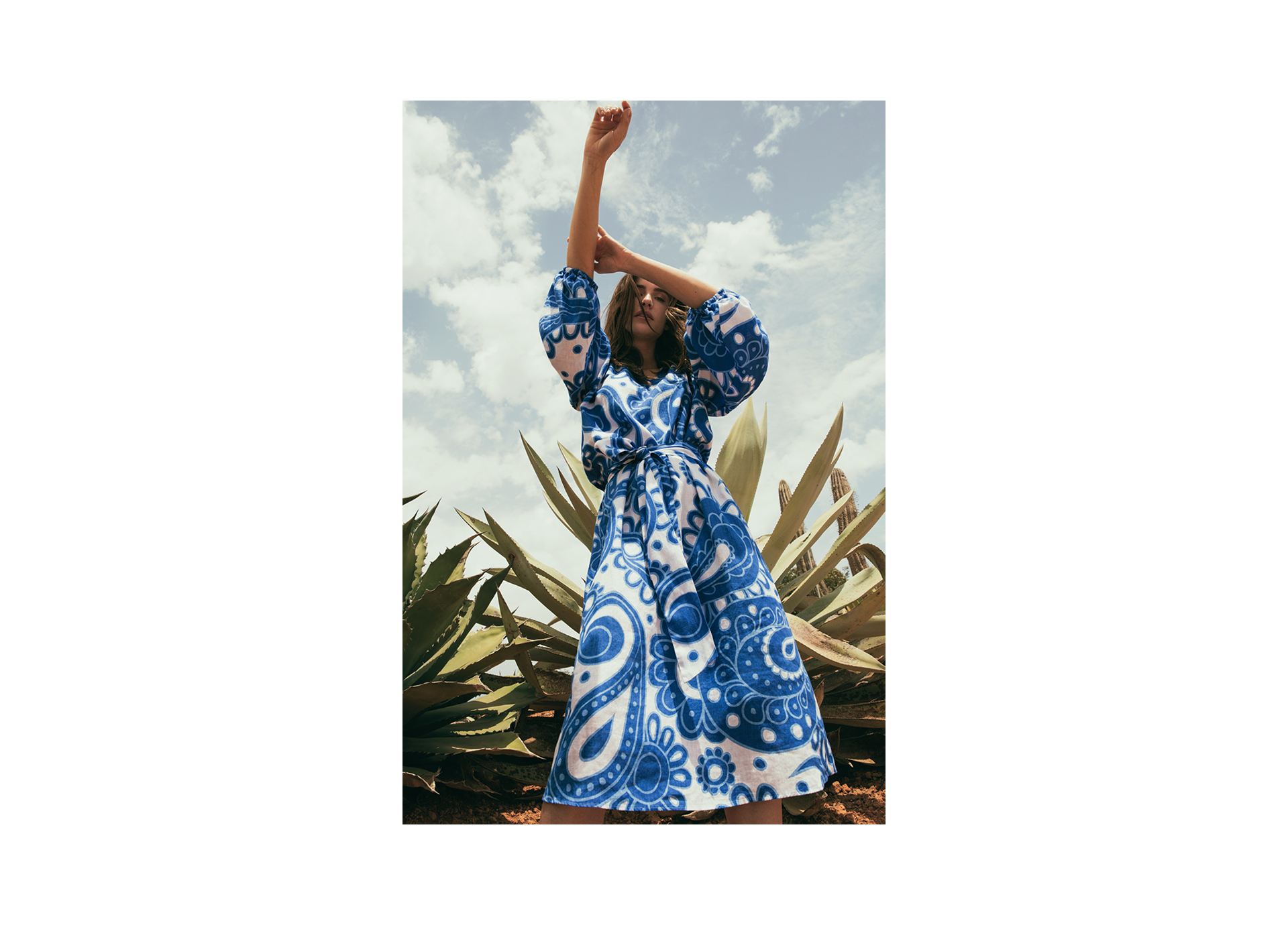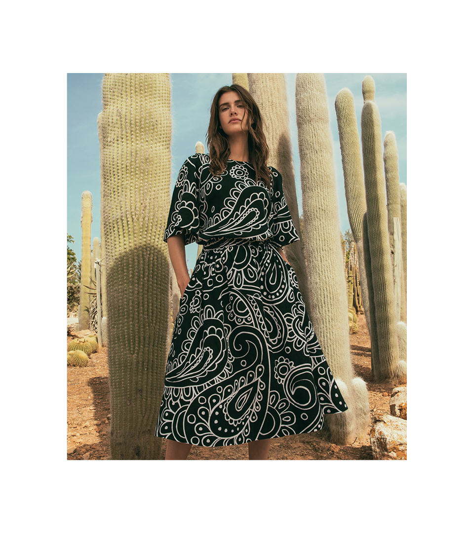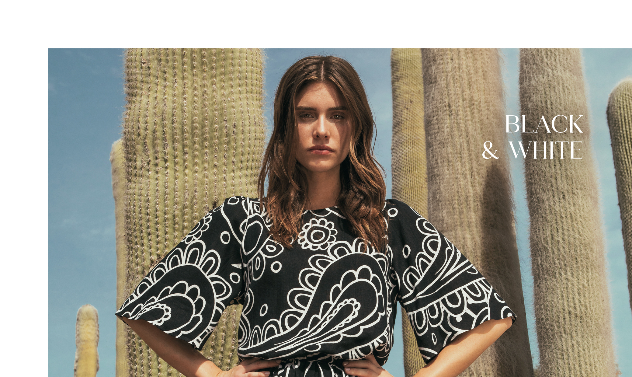Die fokussierte, in Leinen aufgemachte Kapsel, basiert auf dem Spiel mit grafischen Schwarz-Weiß-Kontrasten. Blusen, Shirts, Kleider, Hosenmodelle und Blazer werden durch Paisley Drucke oder Stickereien ästhetisch unterstützt.
