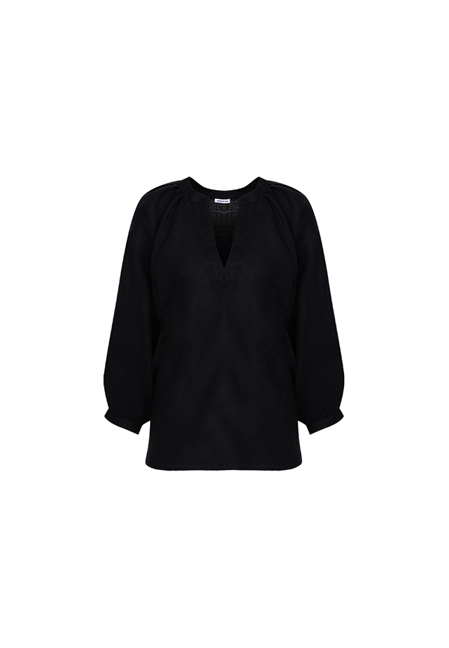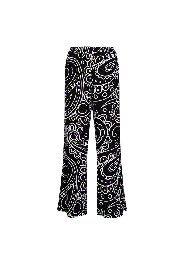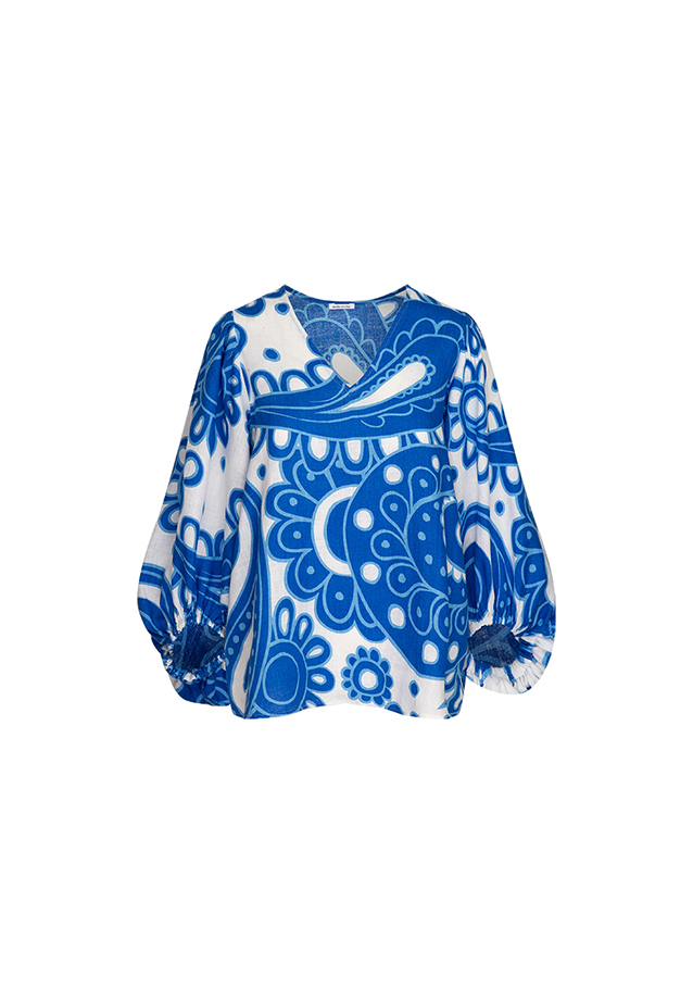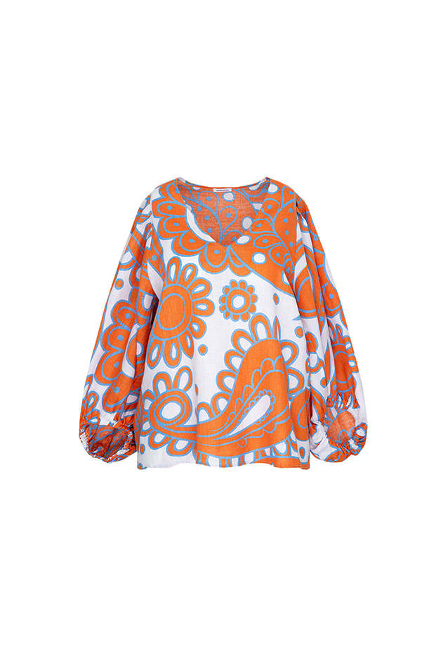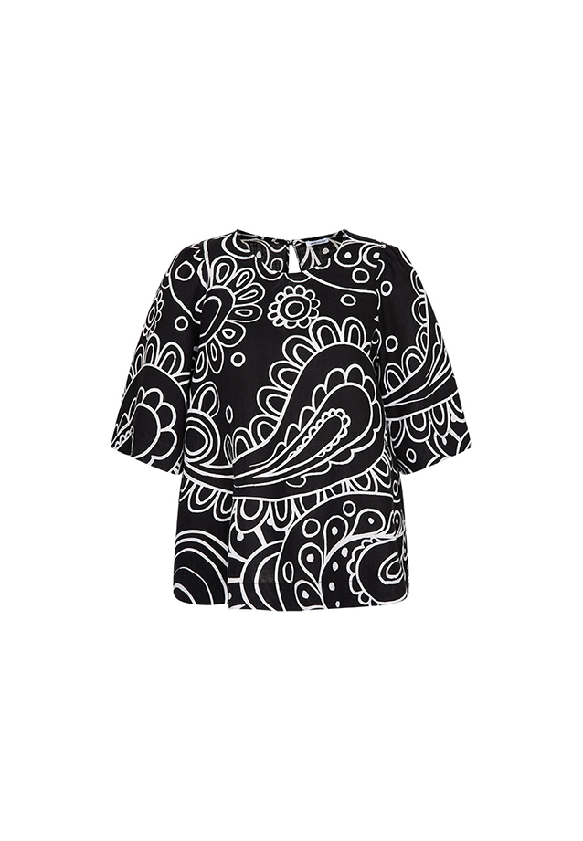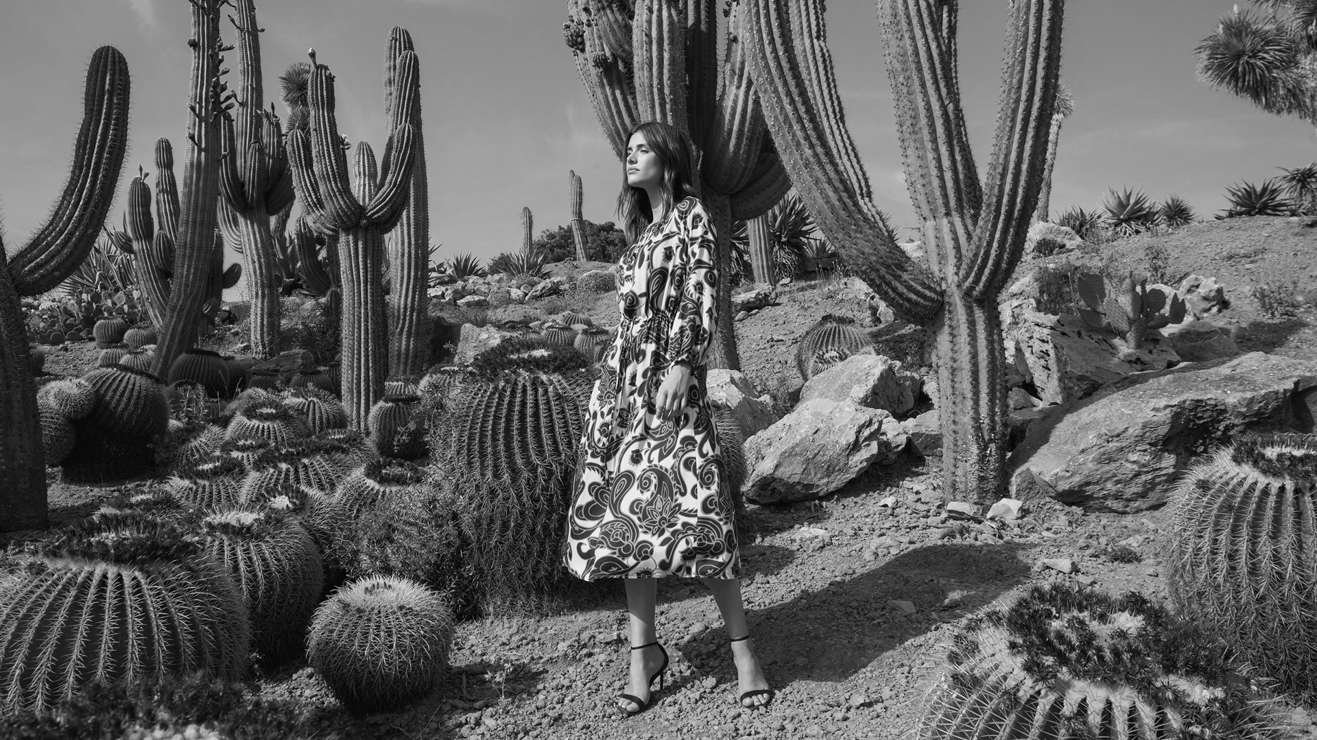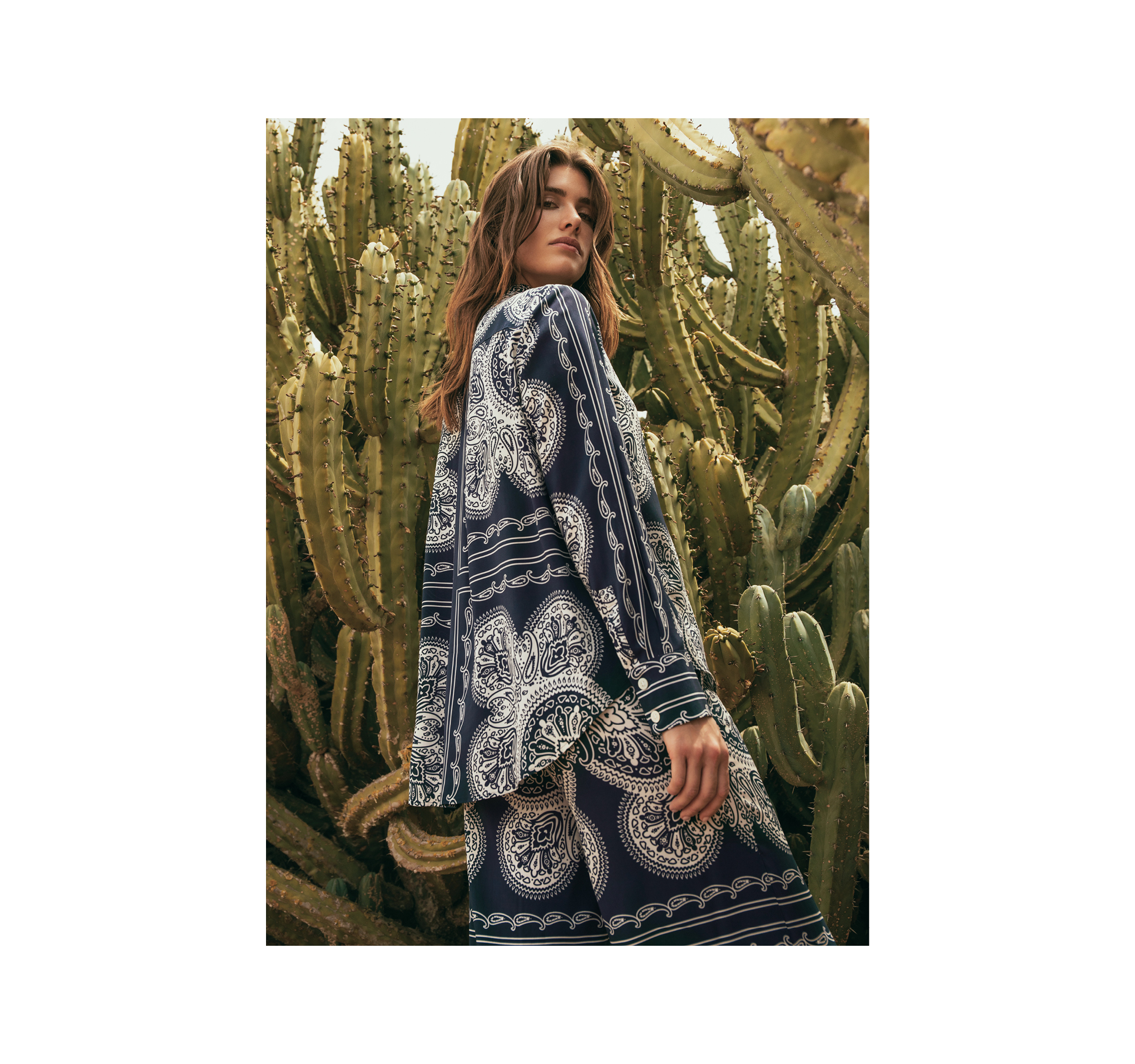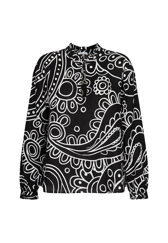 Die fokussierte, in Leinen aufgemachte Kapsel, basiert auf dem Spiel mit grafischen Schwarz-Weiß-Kontrasten. Blusen, Shirts, Kleider, Hosenmodelle und Blazer werden durch Paisley Drucke oder Stickereien ästhetisch unterstützt.