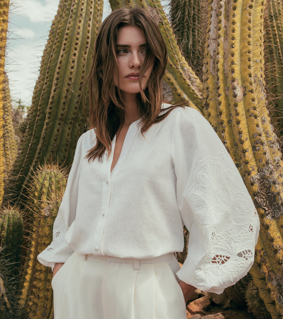 Hochwertiges reines Leinen ist ein Key Thema innerhalb der Sommerkollektion. Die Silhouetten reichen von klassischen Blusen, Hemdblusenkleidern, Shirts und Tuniken bis zu Rock- und Hosenvarianten. Auf Leinen entwickelt das Spiel mit Volumen, Längen und Detaillösungen eine besondere Attraktivität, die durch sommerliche Farbstellungen, Dessinierungen oder Stickereien gesteigert wird.