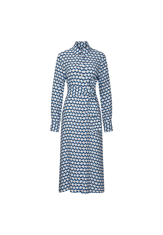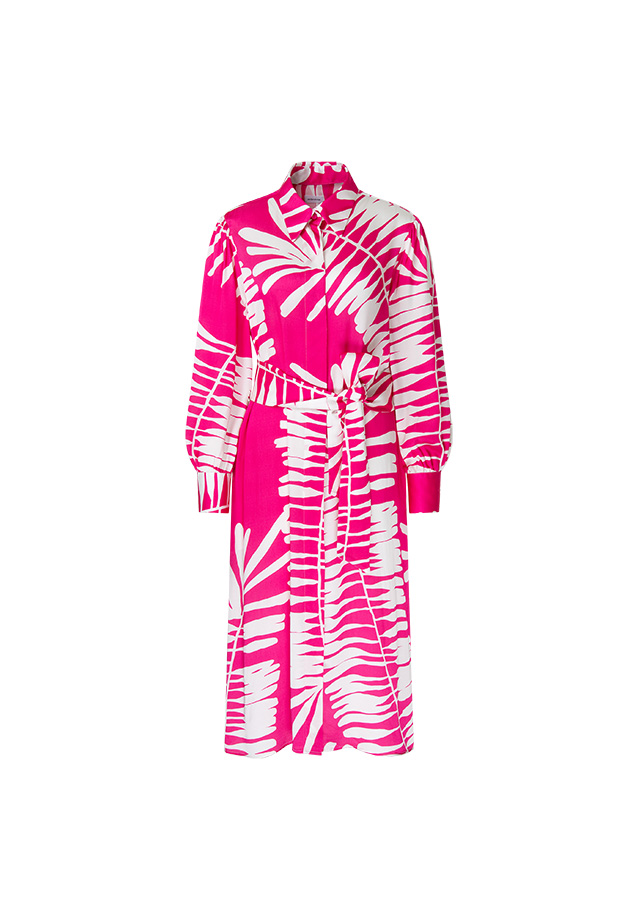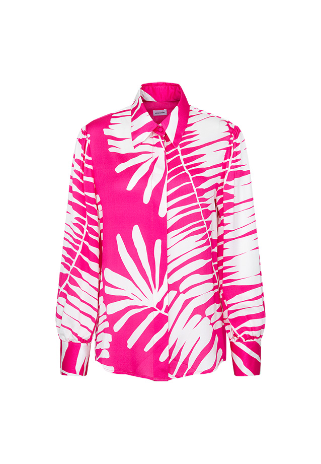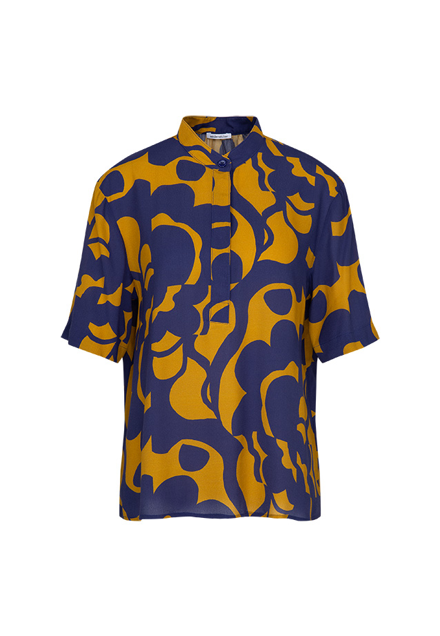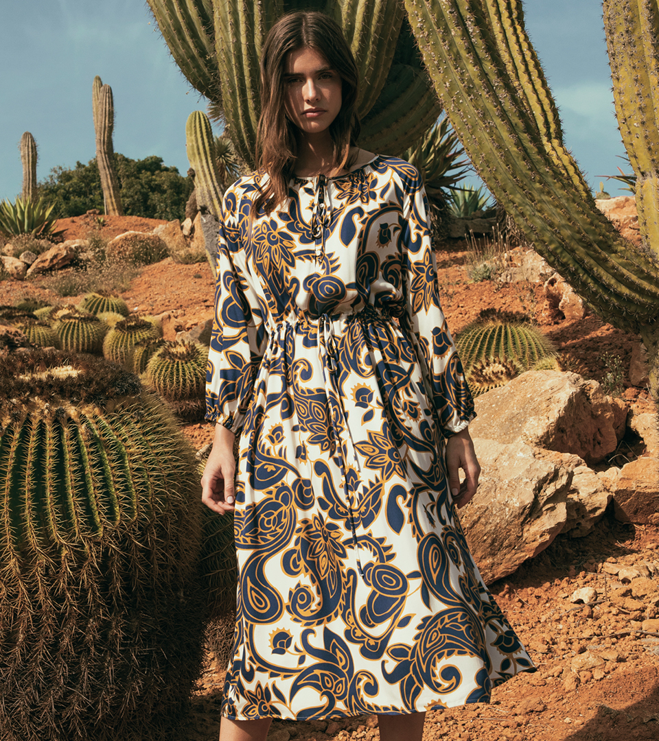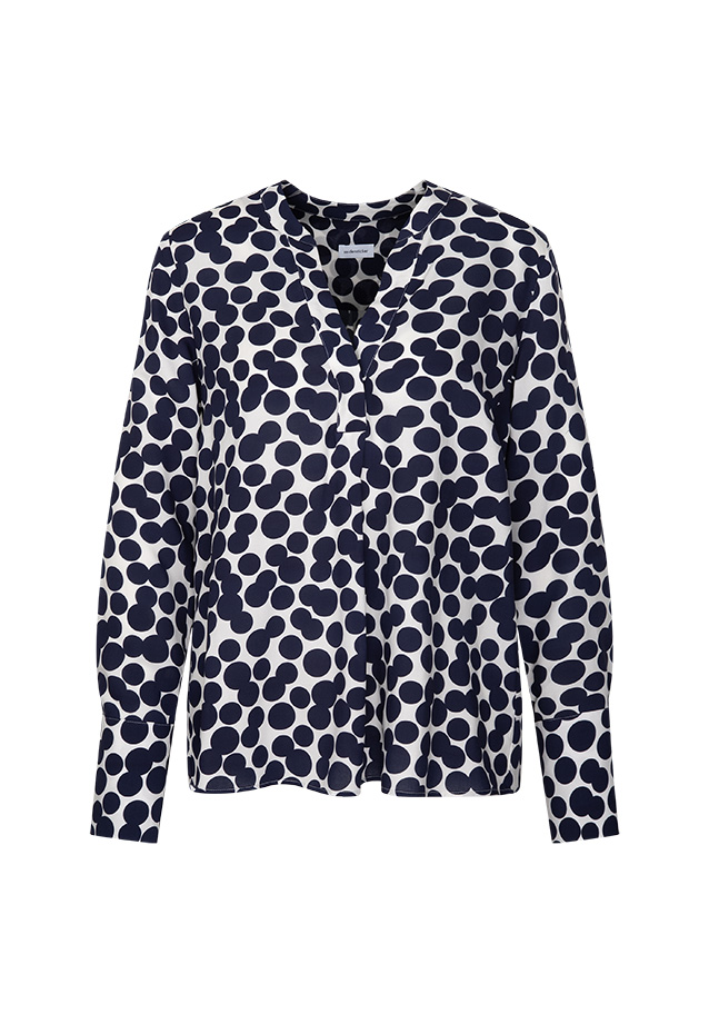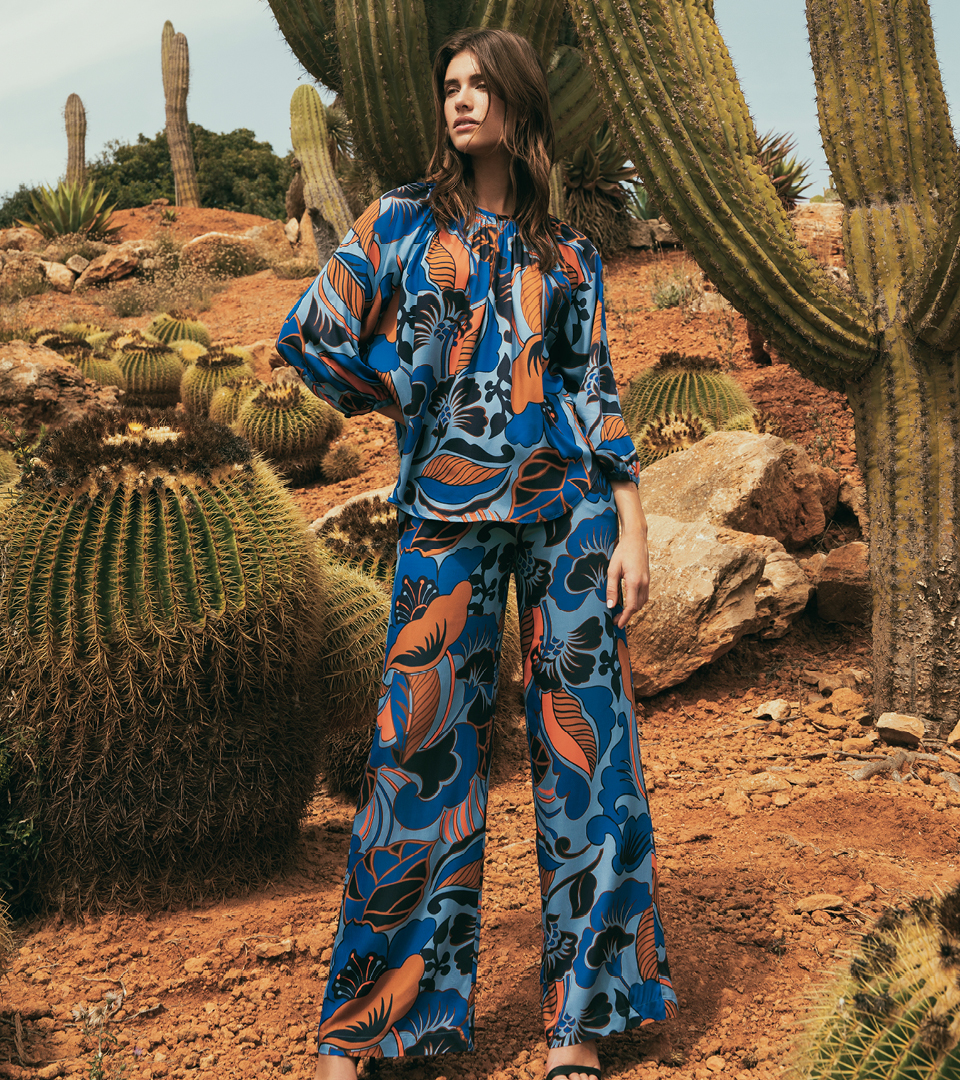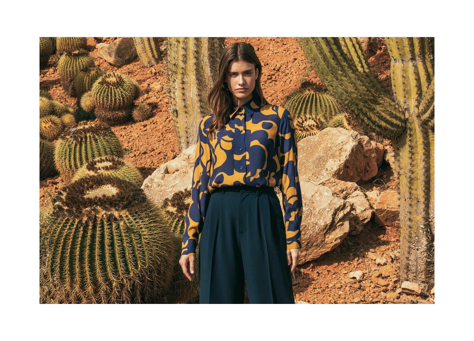 Ausdrucksstarke Druckmotive und neue Kolorits geben der Kollektion ihre individuelle Handschrift. Die Grafiken der neuen Saison arbeiten mit Gegenüberstellungen von reduziert und verspielt, Mikro und Makro, sommerlichen Brights und farblicher Zurückhaltung. Wichtig sind botanische Motive wie Blattstrukturen, verfremdete Blüten oder flächig aufgelöste Ranken. Sie treffen auf neue Streifenbilder, unregelmäßig angeordnete Dots, naiv stilisierte Wolken und Kettenmotive. Dazu kommen opulente Foulardprints und Paisleys. Das Spiel mit unterschiedlichen Stofflichkeiten unterstreicht die grafische Qualität der Druckthemen. Fließende Viskosequalitäten und Satins stehen in Kontrast zu Leinenstrukturen und körnigen Crêpes. Baumwollqualitäten präsentieren sich im Spektrum von dicht gewebten Poplins, und Twillbindungen über feine Cotton/Satins bis zu luftigen Voiles.