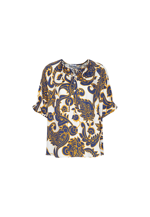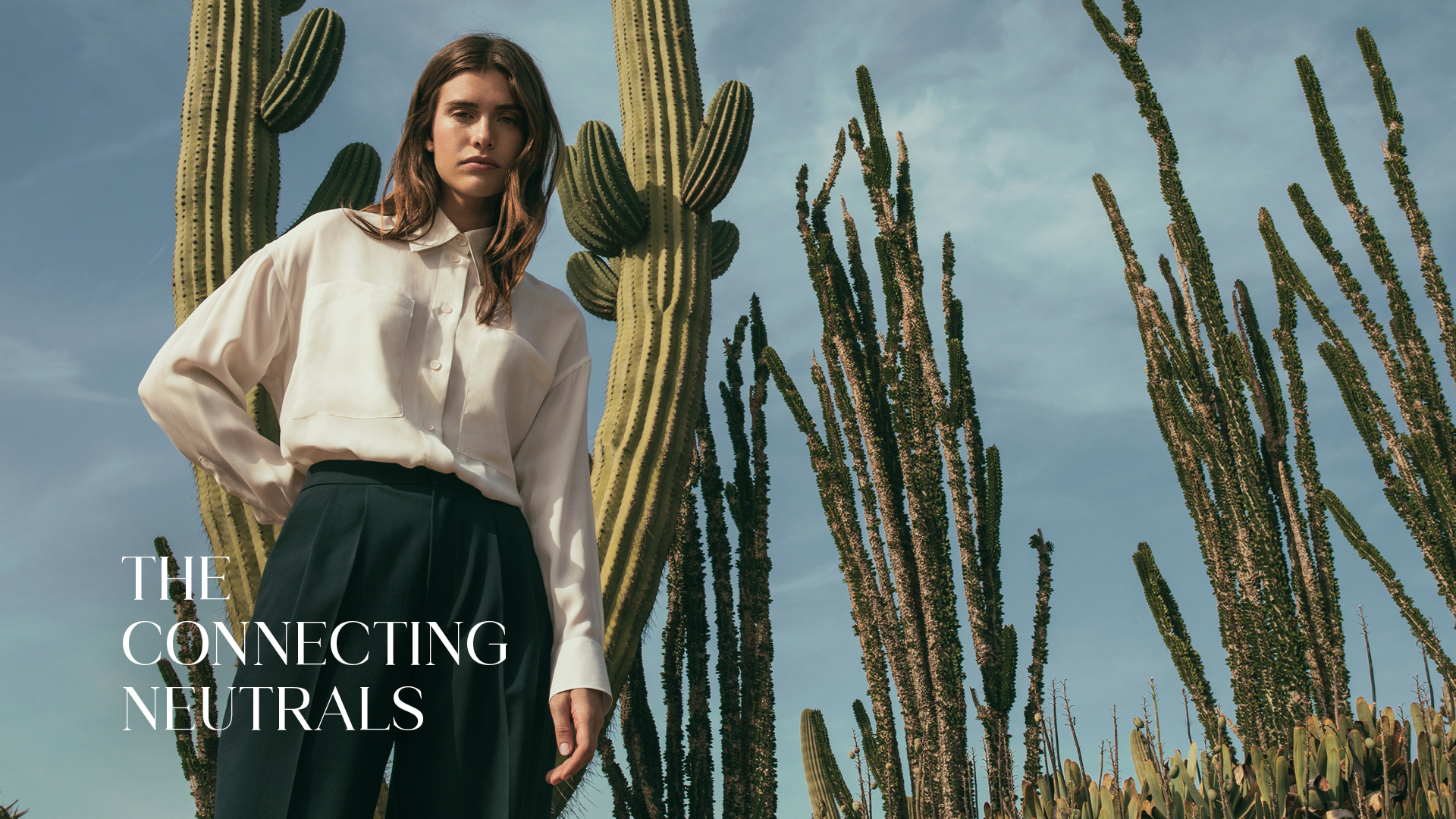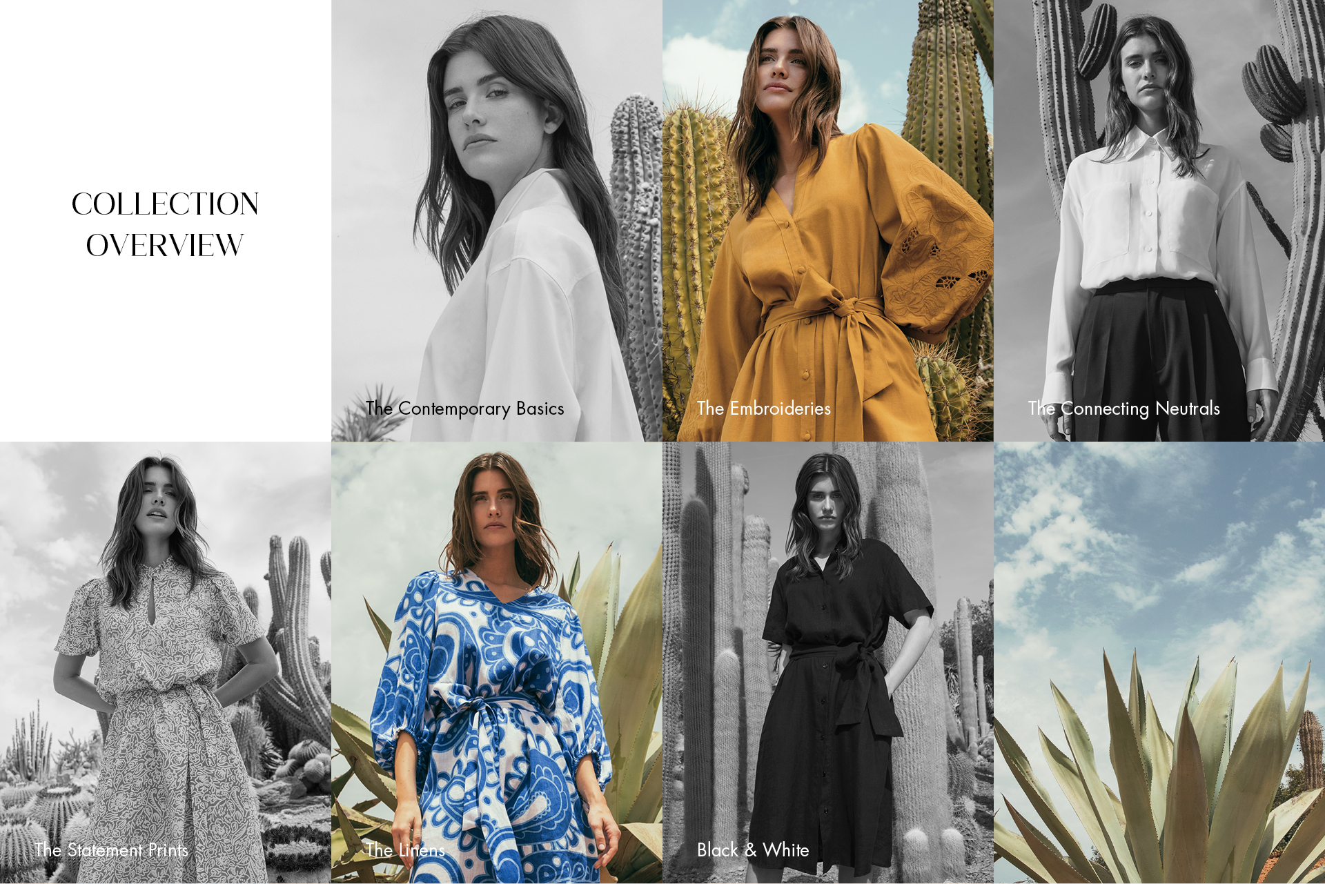 Neutral gehaltene Styles vermitteln zwischen den Print-Themen der Kollektion. Die Kombination aus verschiedenen Silhouetten und Längen, reduzierten Modellen und verspielten Aspekten bildet das gesamte Spektrum der Saison ab. Blusenvarianten, Tuniken und Kleider werden dabei durch kuratiert eingesetzte Blazer, Hosen und Röcke ergänzt. Zusätzlich unterstützt eine breit gefächerte Stoffpalette den thematischen Aufbau. Fließende Viskose-Satins, Chiffons, Modal und subtile Transparenz stehen neben sommerlichem Leinenmischungen, modernen Cottons und Bouclés. Das Farbkonzept basiert auf Neutraltönen, die innerhalb der Liefertermine als harmonisches Bindeglied funktionieren.