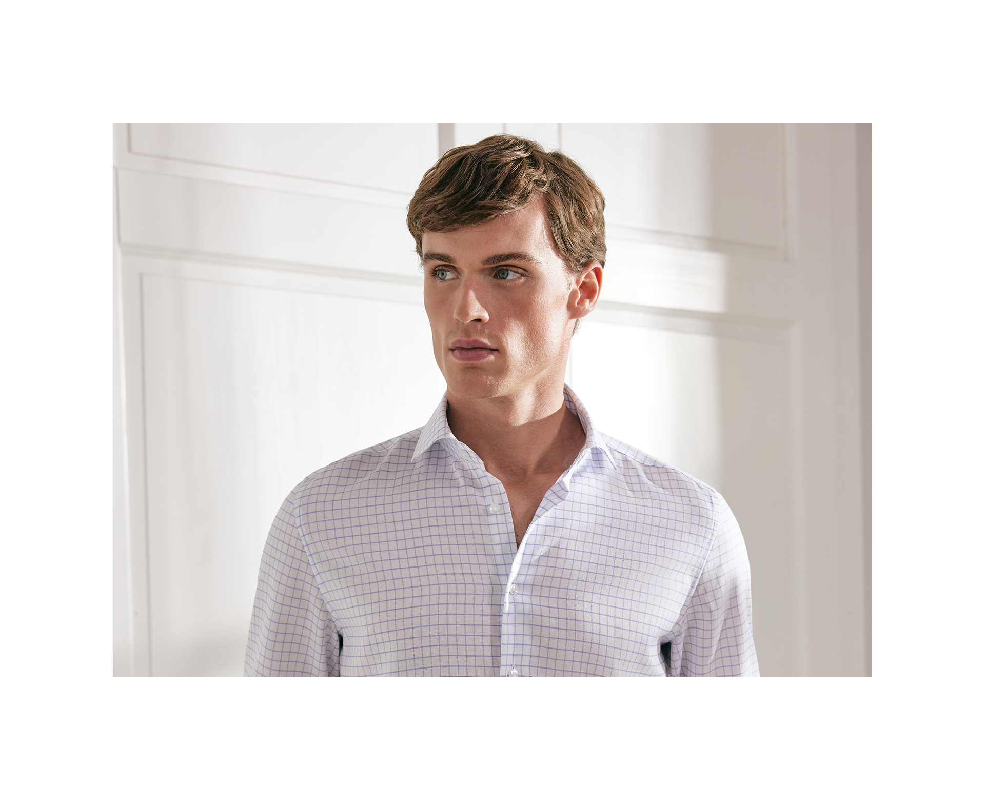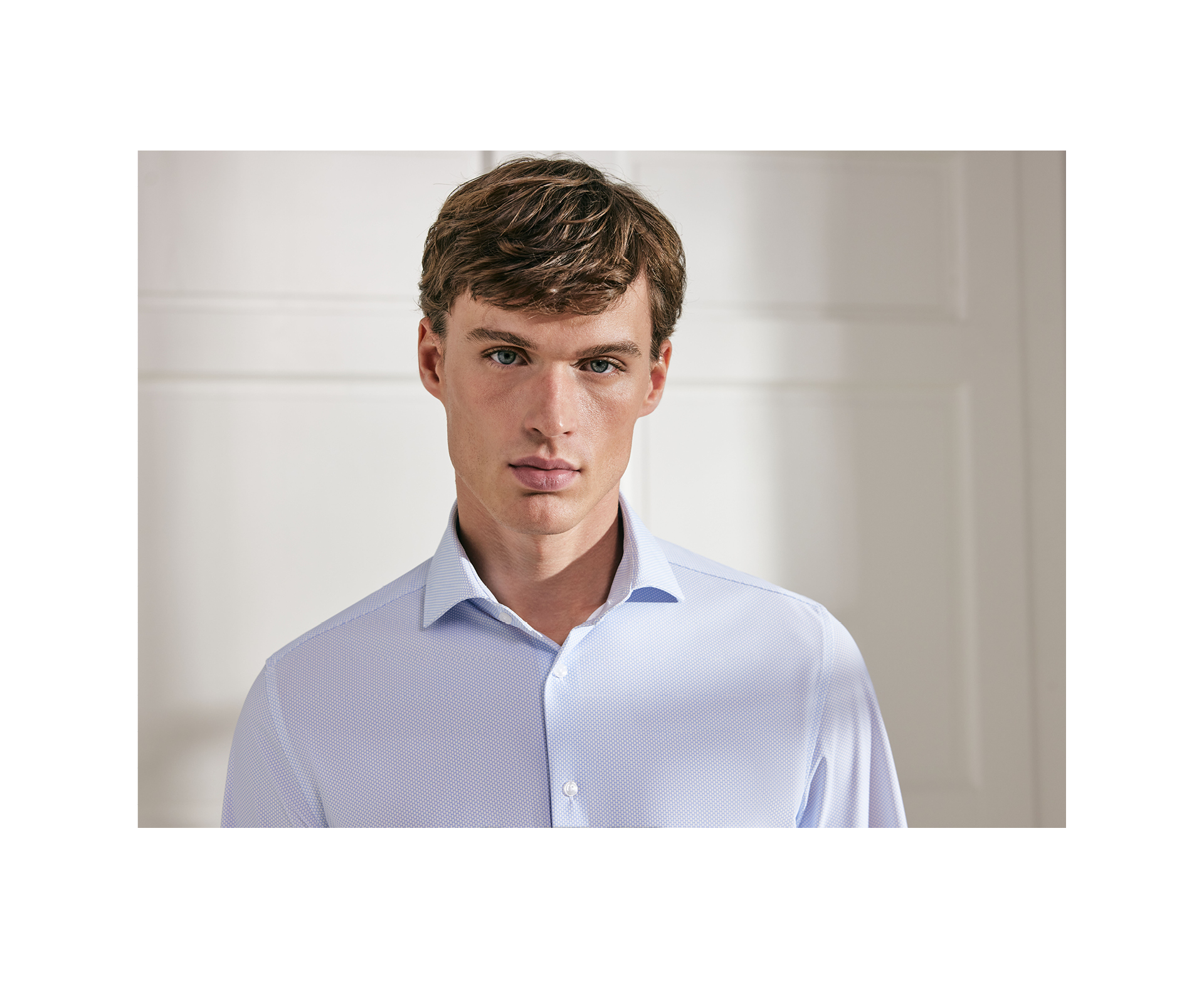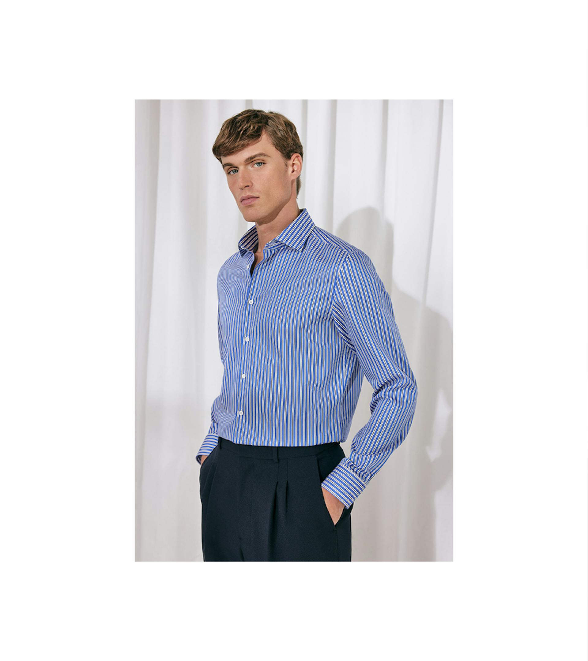 Eine Vielzahl klassischer Krägen unterstreicht die stilistische Tiefe und erweitert die Varianz innerhalb der Linie. Sowohl die Farben als auch die verwendeten Materialien vermitteln Wertigkeit und einen maskulinen Charme. Edle Materialien wie feinfädige Baumwolle, dicht gesetzte Garne und edler Satin treffen auf dreidimensionale Strukturen und ausgefeilte Bindungen.