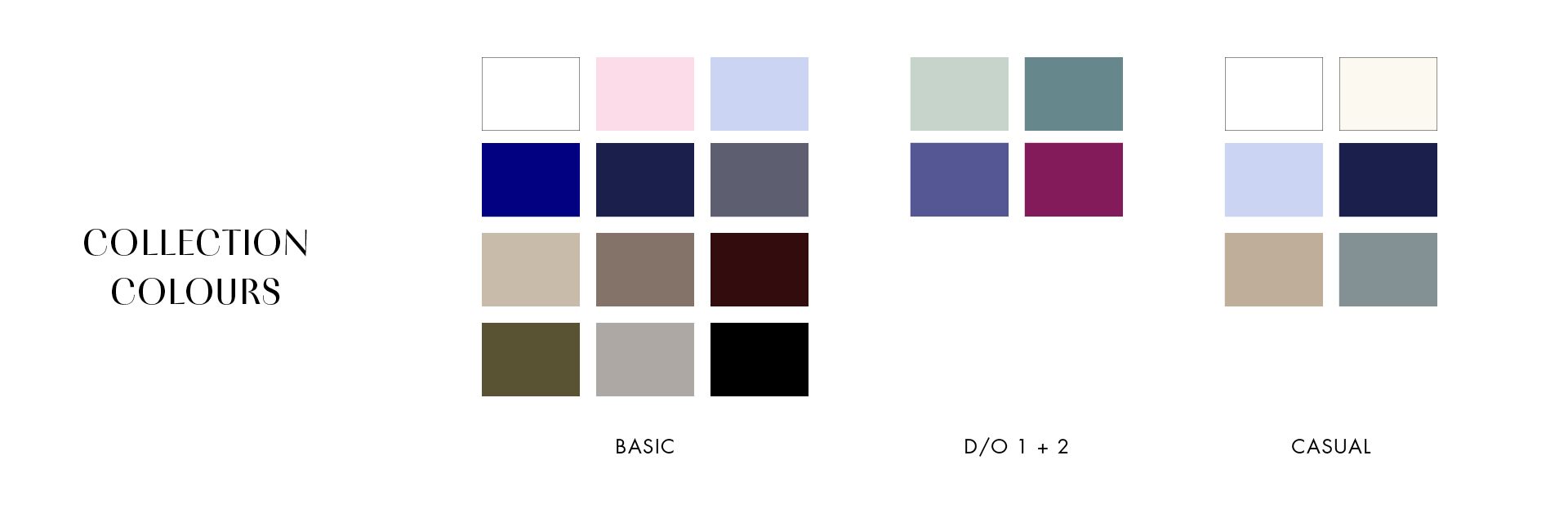 Die Basis bilden Weiß, Blauschattierungen, Graunuancen und dunkle Naturtöne. Die Blautöne sind chromatisch angeordnet, starten mit Lichtblau und spannen sich über Italian Blue bis zu Navy. Sie werden durch klassisches Rosé und pudriges Flieder ergänzt. Die Graupalette setzt sich aus warmem Mineral-Grau, einem metallischen Grauton, Ebenholz und bläulich unterlegtem Graphit zusammen. Taupe-Beige, Espresso, Java Braun und Dark Olive wirken erdig und zeigen maskulinen Appeal. In den Lieferterminen werden die Basics durch sommerliche Brights ergänzt. Berry und Salbei akzentuieren den ersten Liefertermin. Im zweiten Liefertermin ergänzen Lemon und gebranntes Korallenrot die Basistöne.