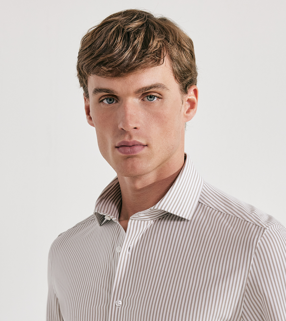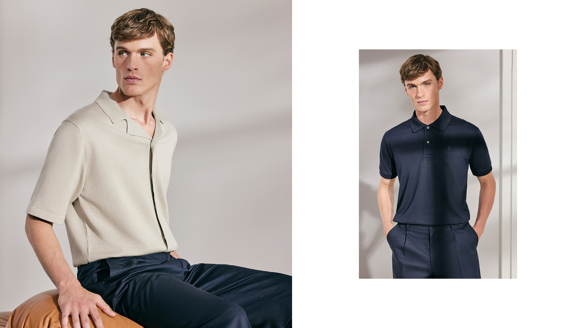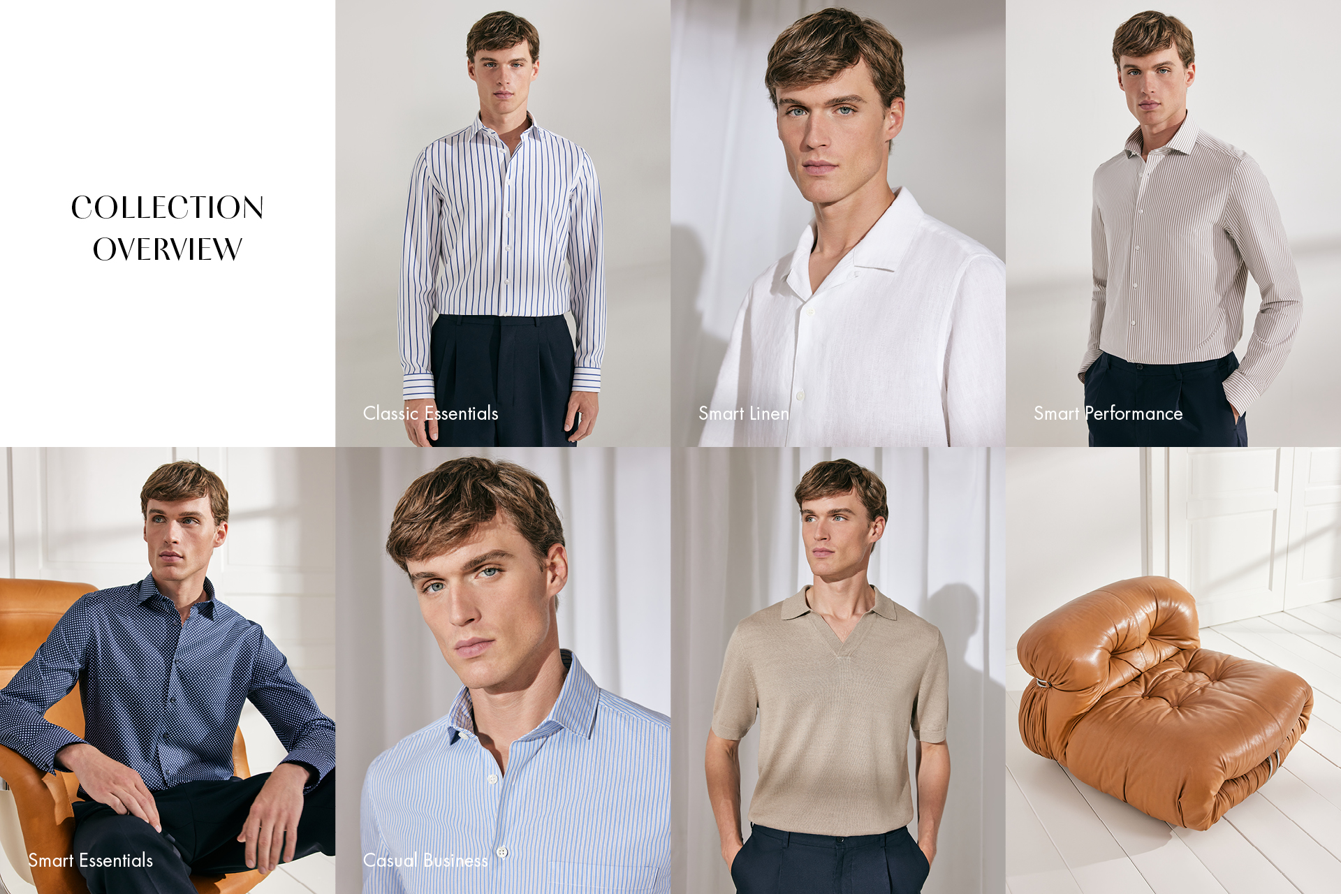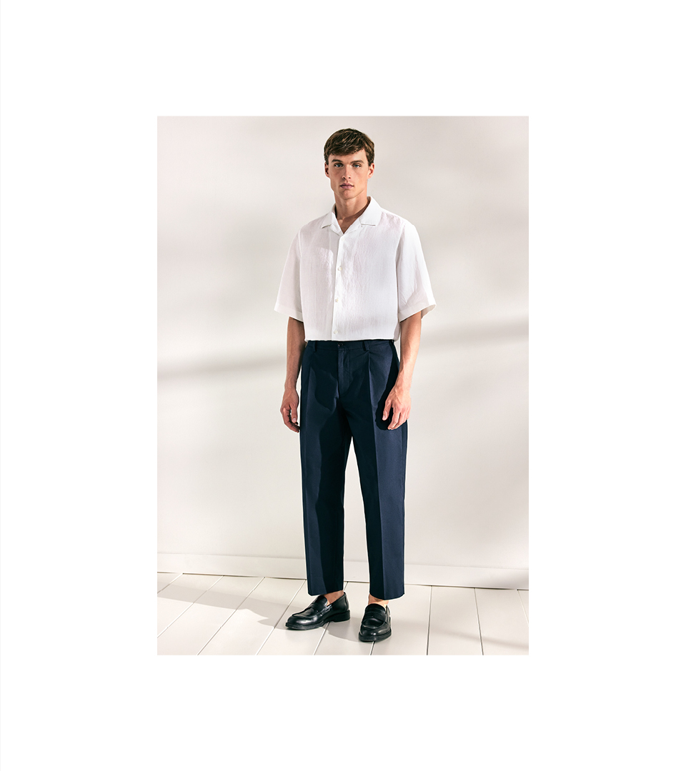 Soft gewaschene Hemden mit Button-down- oder Kentkragen bilden zusammen mit Resort-Shirts die thematische Essenz. Als harmonische Ergänzung dazu werden Overshirt-Varianten, Chinos und Bermudas aus Leinen und Cotton Twill angeboten. Abgerundet wird das Sortiment durch ein dekonstruiertes Sakko. Im Warenbild liegt der Schwerpunkt auf Oxfords, soften Twills, Blue-Denims, einer Cotton-Leinen Mischung und Seersucker. Streifen, feine Karos und Unis prägen das Gesamtbild und verleihen dem Casual-Segment stilistische Klarheit. Das arrondierende Strickprogramm wird durch leichten Merinostrick, Pima-Cotton und gecrêpte Baumwollqualitäten aufgemacht und durch sommerliche Leinenmischungen abgerundet. Hinzu kommen T-Shirts und Polos aus merzerisierter Baumwolle, technischer Cotton als Resort, feinkörniger Piqué und merzerisierter Jersey.