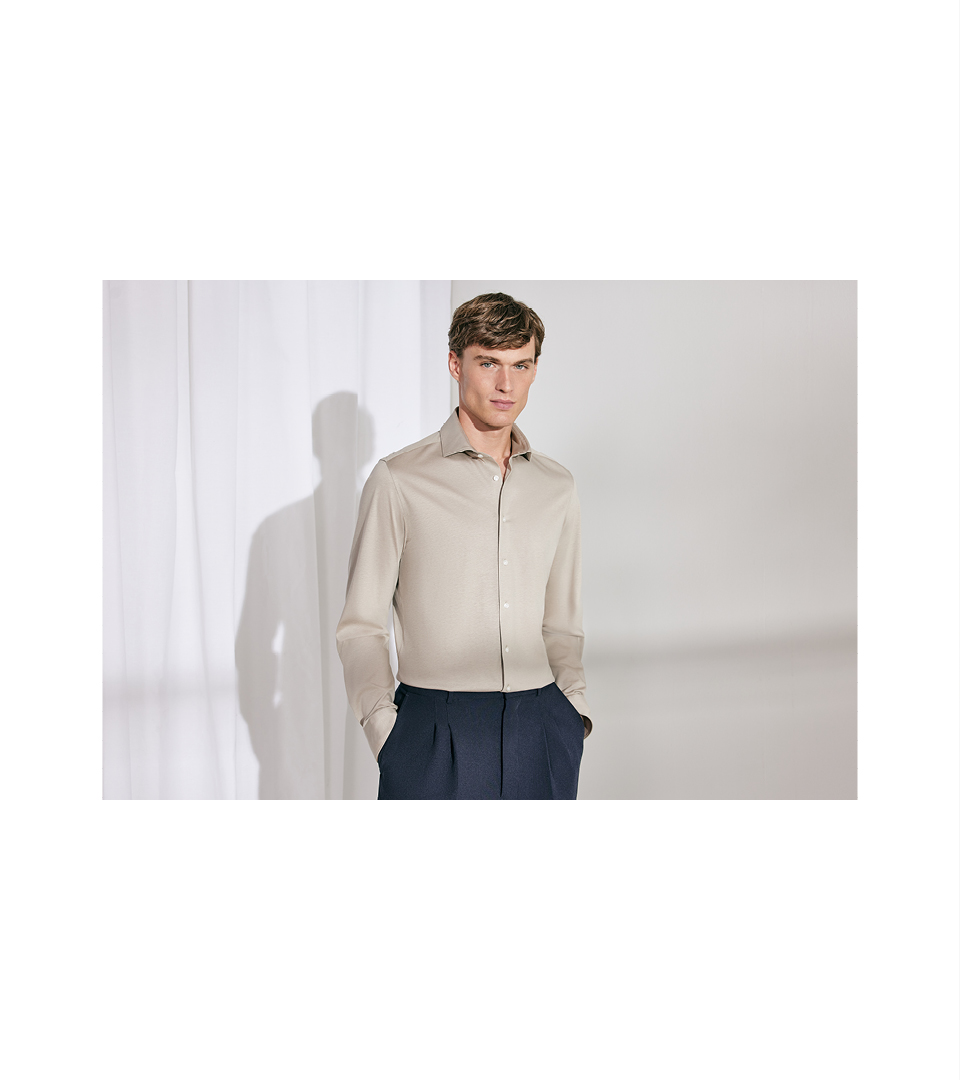 Komfort und Funktionalität stehen im Fokus: 4-Way-Stretch, antimikrobielle Ausrüstung und Soft-Touch-Qualitäten erfüllen die Ansprüche aktiver Lebensstile. Gezeigt werden klassische, grafisch gestaltete Dessinierungen, leichte Qualitäten und subtile Farbtöne mit hohem Weißanteil. Unis, Strukturen und Streifen werden mit Mikro-Mustern kombiniert. Ergänzt wird die Linie durch merzerisierten Jersey.