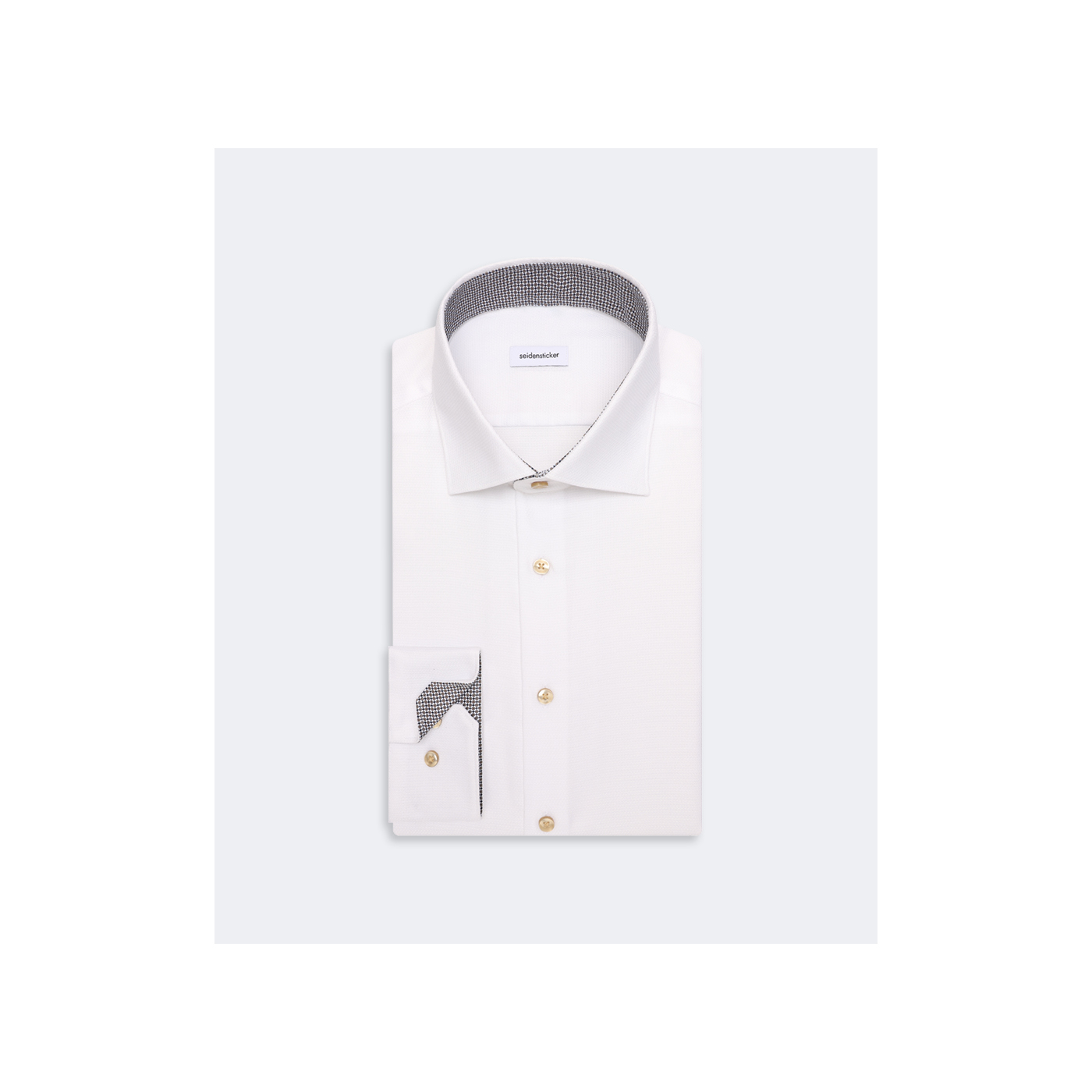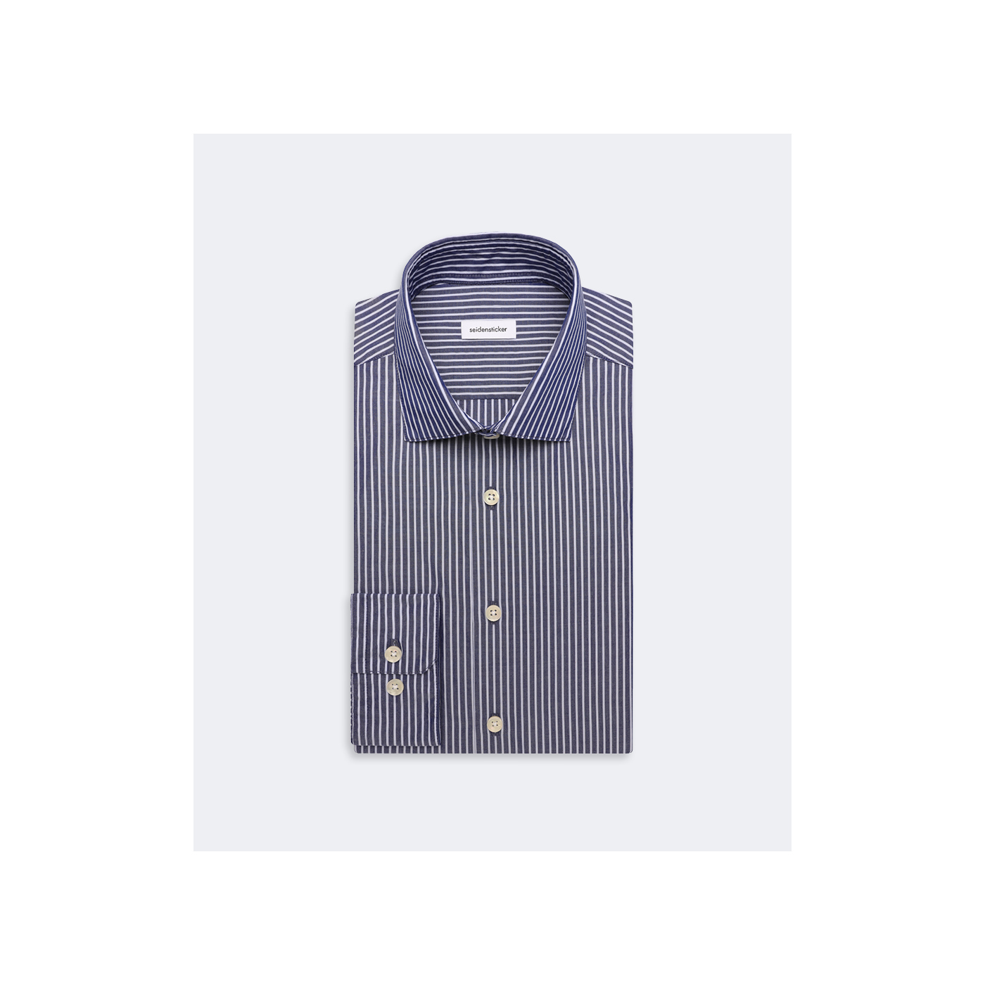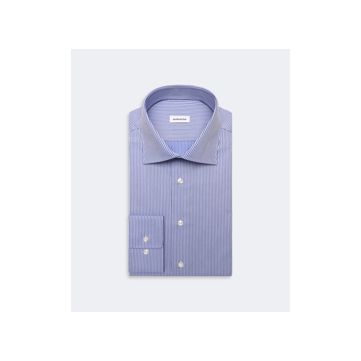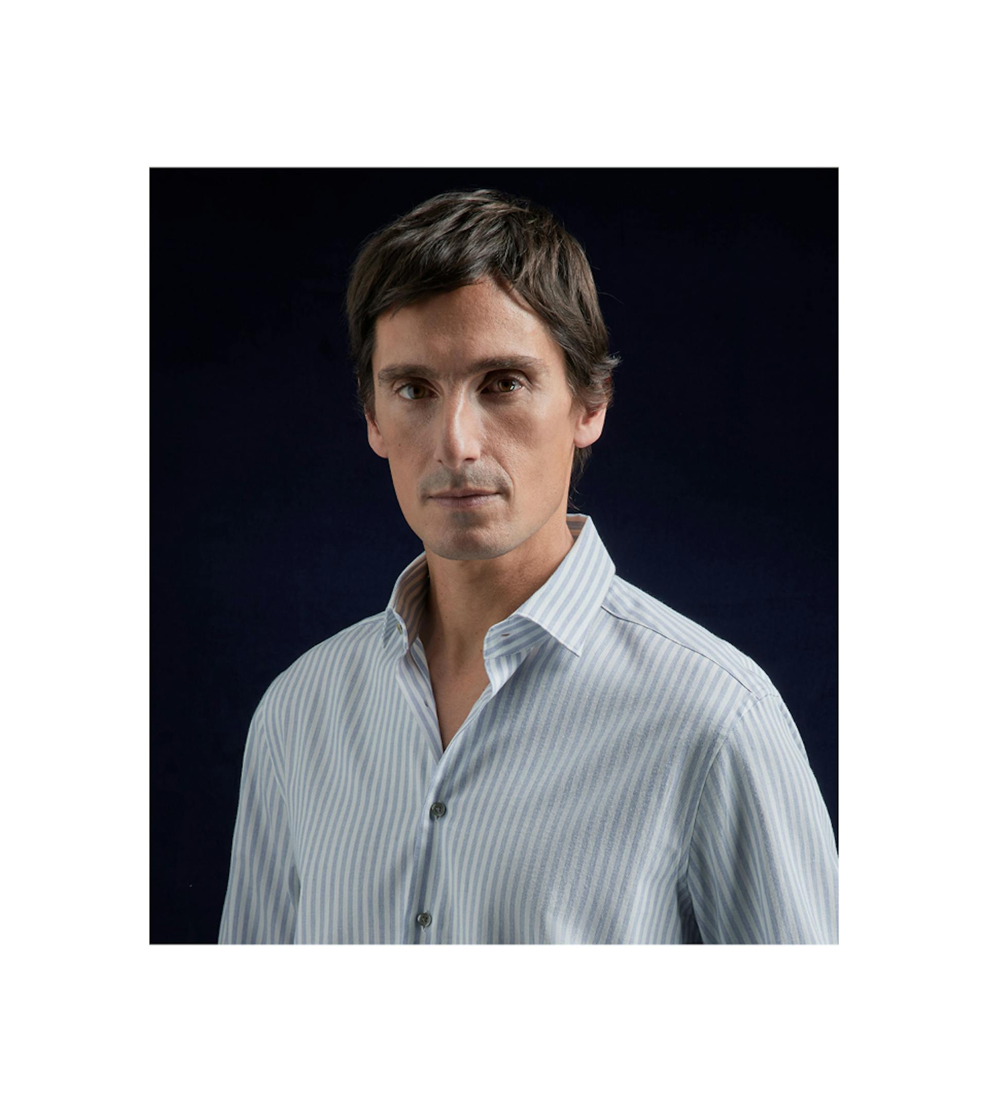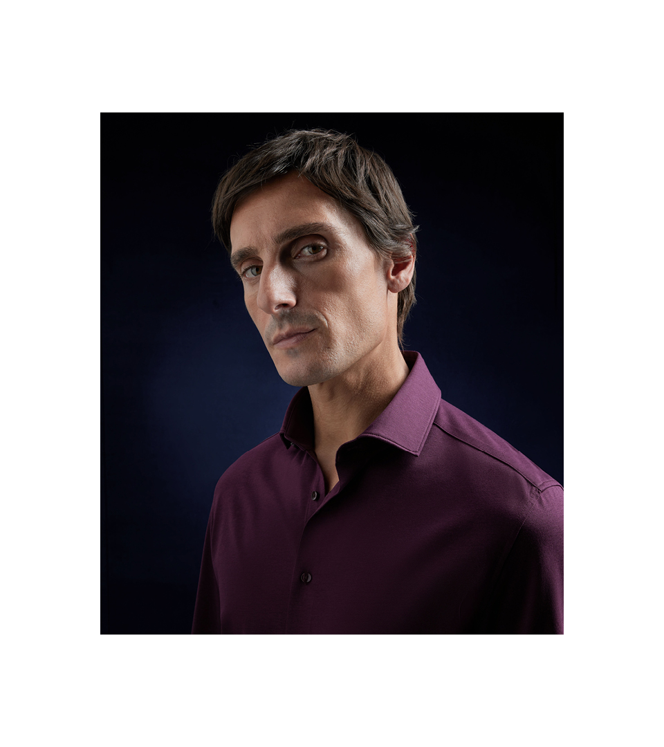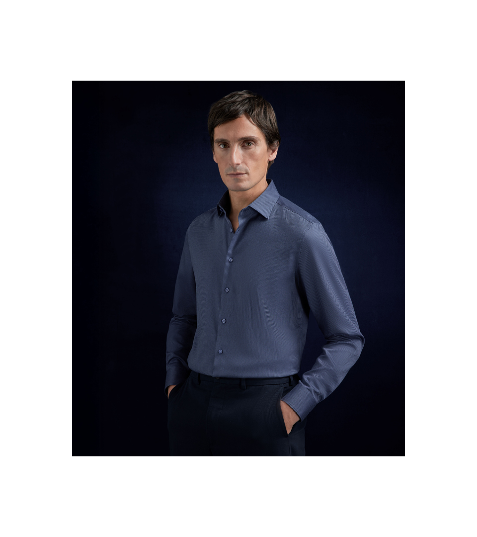 The focus is on plain fabrics, classic stripes and fine checks. In terms of materials, fine-thread cotton, densely woven yarns, elegant satin, three-dimensional structures and sophisticated weaves come together. Generous, finely cut collar shapes complement the variety of classic collars and create stylistic depth and variety.