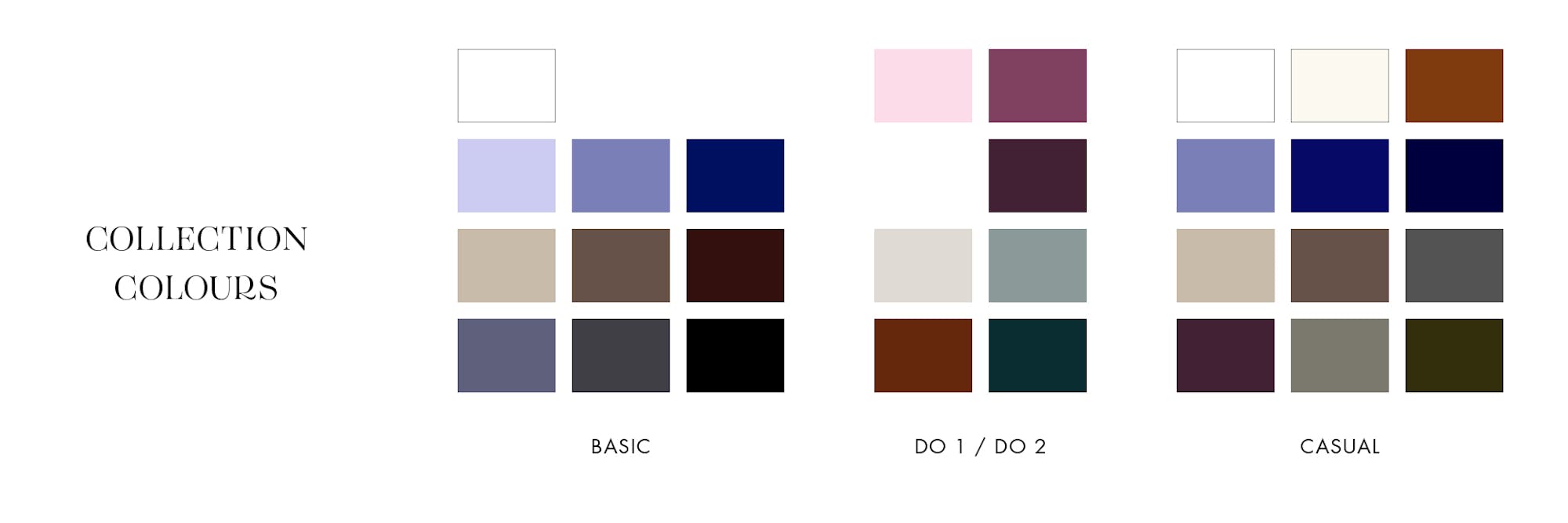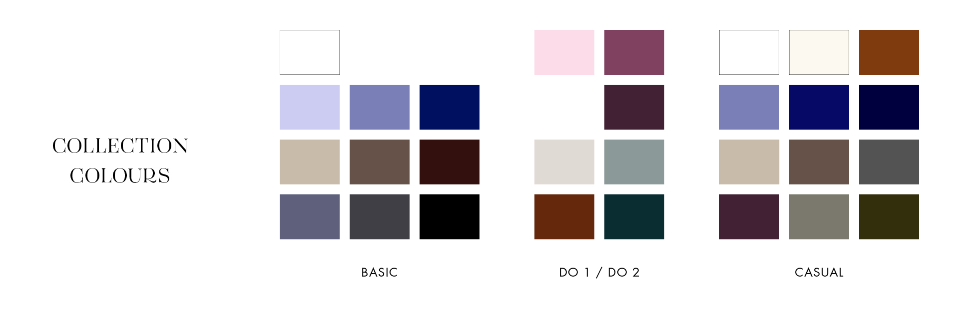 The basis is formed by white, finely graded shades of blue, differentiated shades of grey and a range of brown and beige shades, which lend depth and sophistication to the colour scheme. Complementary rust and cognac tones intensify the masculine expression. The blue palette ranges from light sky blue to powdery indigo and rich navy. Accents are created by classic rosé, selected berry tones and deep burgundy. Depending on the delivery date, icy green shades and intense dark green expand the spectrum. The finely coordinated colour scheme ensures smooth transitions and a harmonious overall picture.