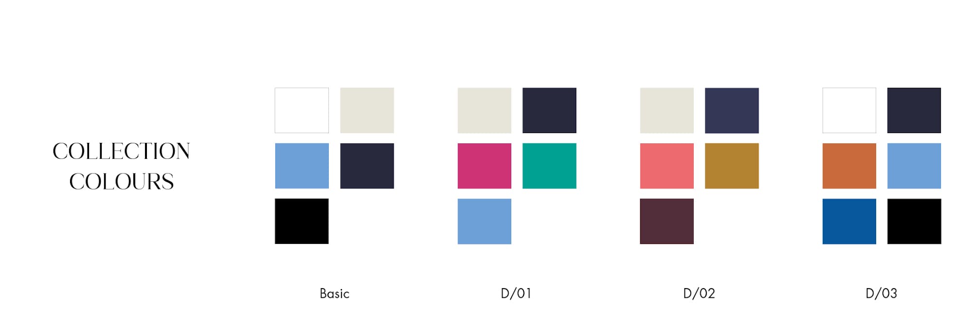 Optisches Weiß und Ivory lassen Fonds und Dessinierungen kontrastreich oder dezent zurückhaltend wirken. Die Basis der Kollektion bilden kräftiges Maritim-Blue und weiches Ciel. Im ersten Liefertermin werden Ivory, Maritim Blue und Ciel mit leuchtendem Pool-Grün und expressivem Pink akzentuiert. Wärme und Exotik charakterisieren den Farbaufbau des zweiten Liefertermins. Rötlich schimmerndes Anemonenblau wird hier mit Koralle, Ceylon-Gelb, Dark Grape und Ivory kombiniert. Spannungsreiche Kombinationen aus optischem Weiß, strahlenden Blaunuancen und gebranntem orientalischem Orange kennzeichnen den dritten Liefertermin. Die Liefertermine werden jeweils von einer grafischen Schwarz/Weiß-Kapsel begleitet.