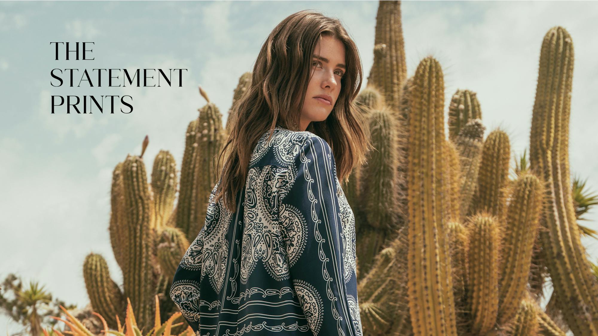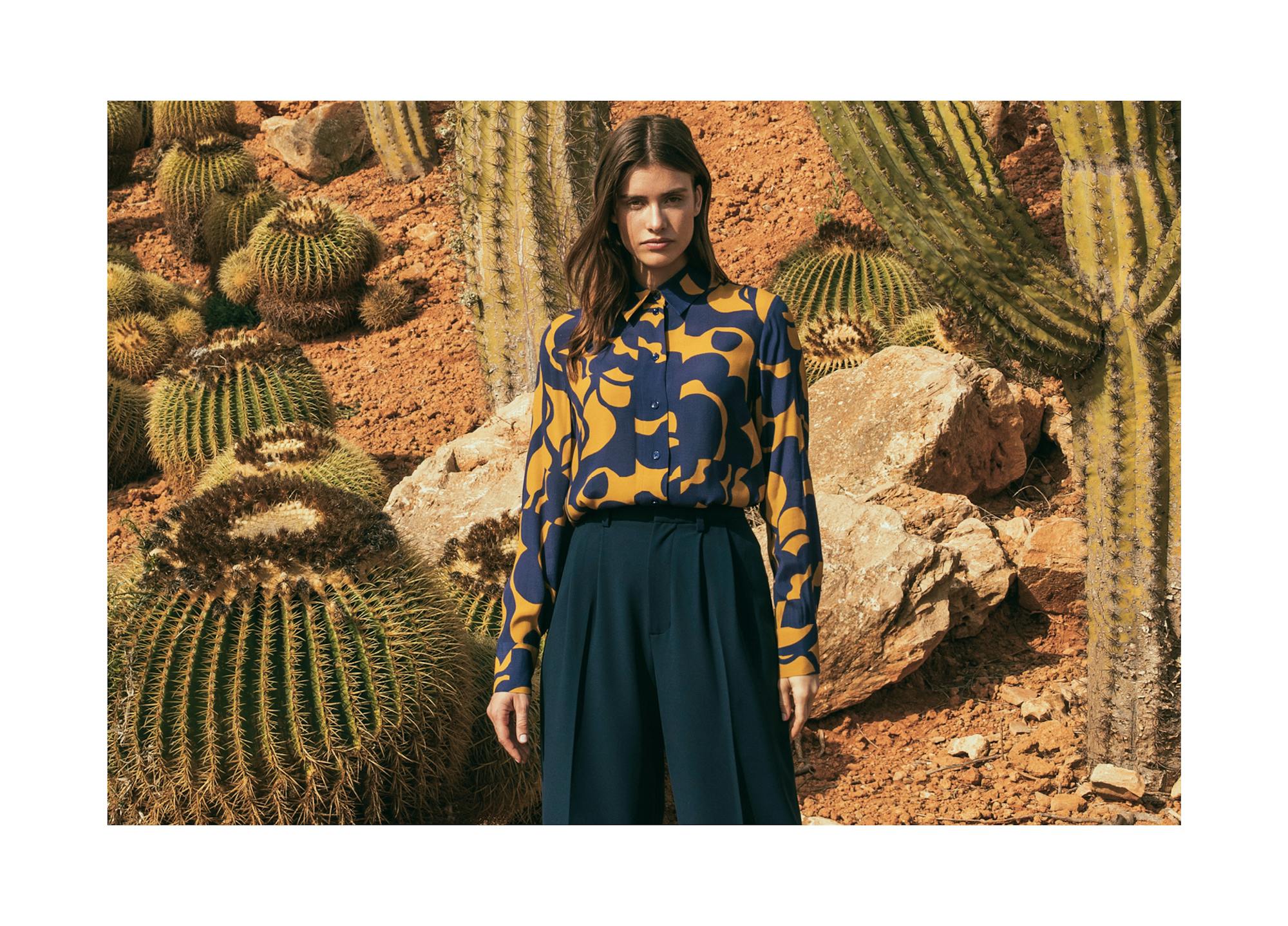 Ausdrucksstarke Druckmotive und neue Kolorits geben der Kollektion ihre individuelle Handschrift. Die Grafiken der neuen Saison arbeiten mit Gegenüberstellungen von reduziert und verspielt, Mikro und Makro, sommerlichen Brights und farblicher Zurückhaltung. Wichtig sind botanische Motive wie Blattstrukturen, verfremdete Blüten oder flächig aufgelöste Ranken. Sie treffen auf neue Streifenbilder, unregelmäßig angeordnete Dots, naiv stilisierte Wolken und Kettenmotive. Dazu kommen opulente Foulardprints und Paisleys. Das Spiel mit unterschiedlichen Stofflichkeiten unterstreicht die grafische Qualität der Druckthemen. Fließende Viskosequalitäten und Satins stehen in Kontrast zu Leinenstrukturen und körnigen Crêpes. Baumwollqualitäten präsentieren sich im Spektrum von dicht gewebten Poplins, und Twillbindungen über feine Cotton/Satins bis zu luftigen Voiles.