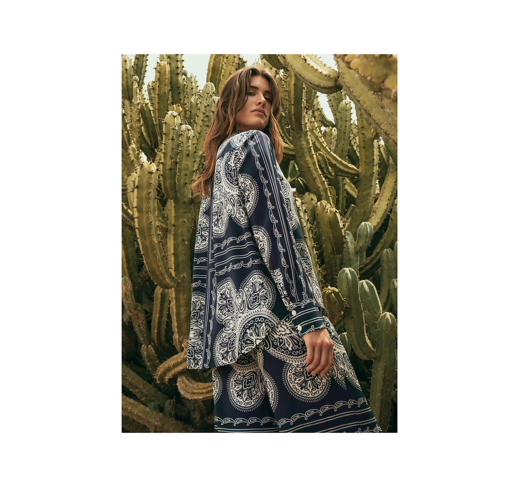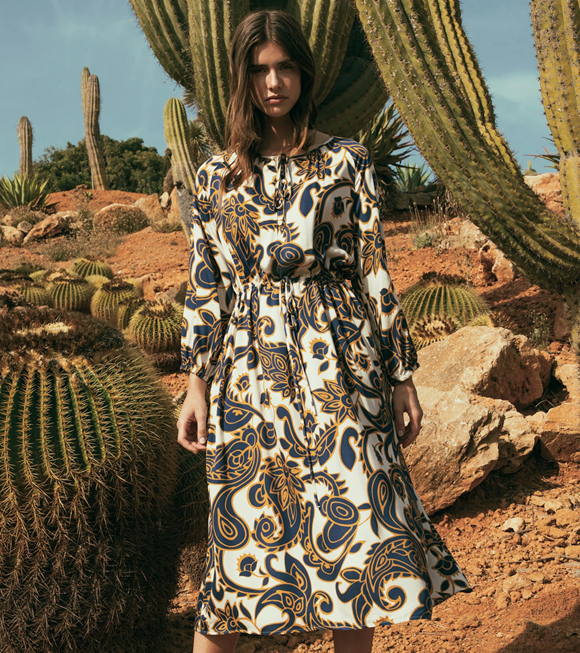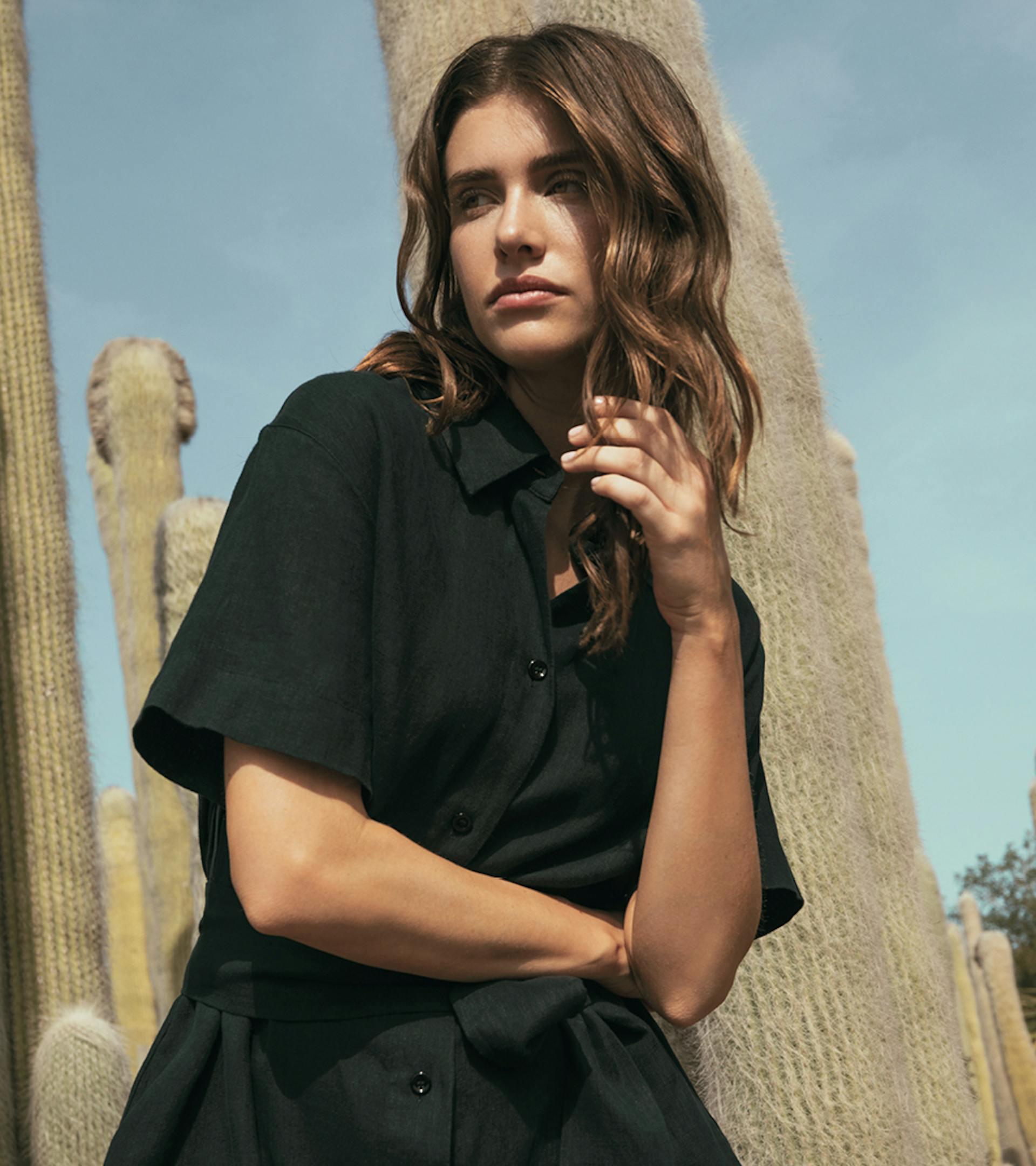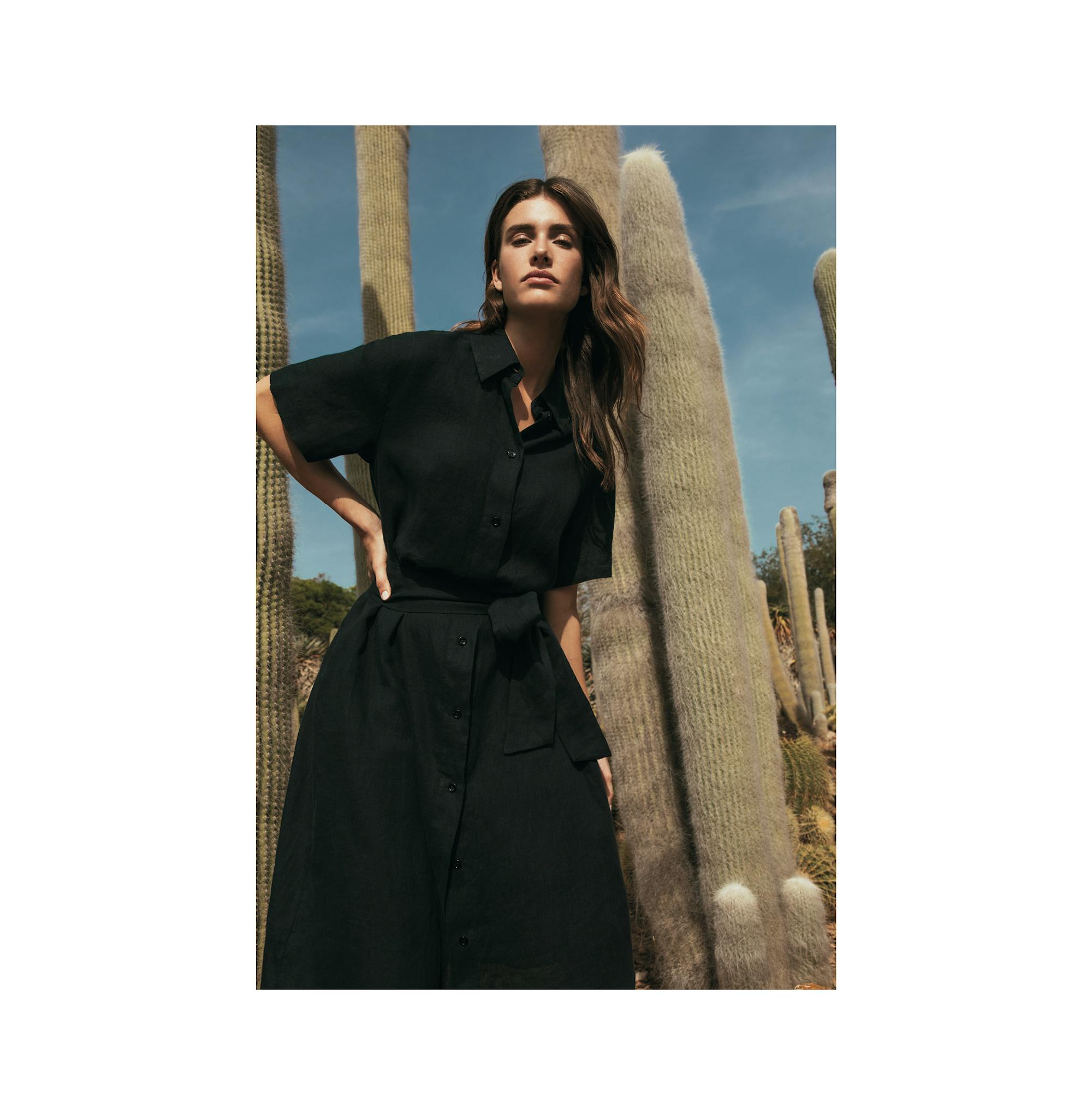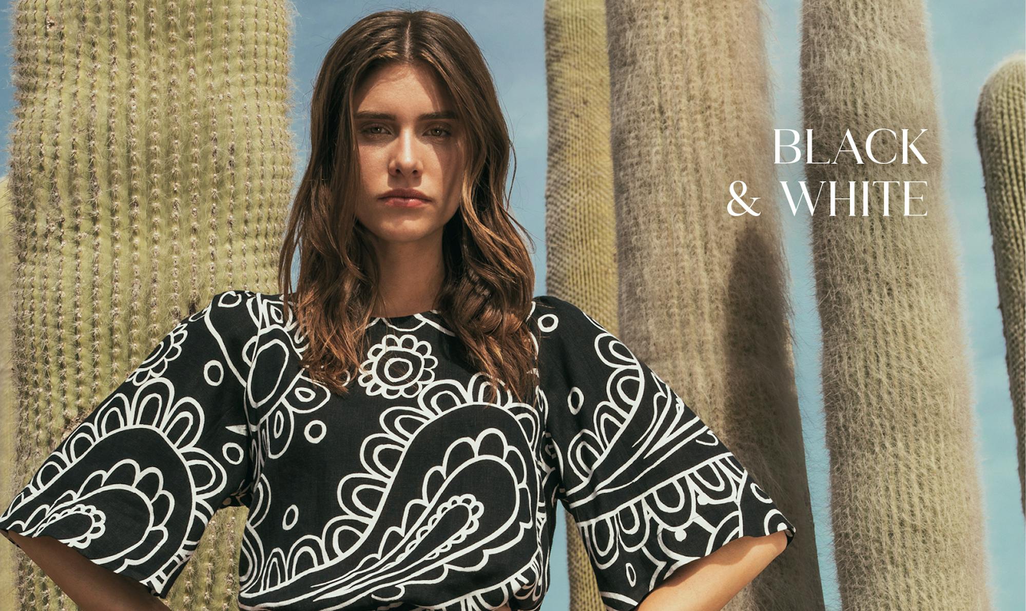 Die fokussierte, in Leinen aufgemachte Kapsel, basiert auf dem Spiel mit grafischen Schwarz-Weiß-Kontrasten. Blusen, Shirts, Kleider, Hosenmodelle und Blazer werden durch Paisley Drucke oder Stickereien ästhetisch unterstützt.