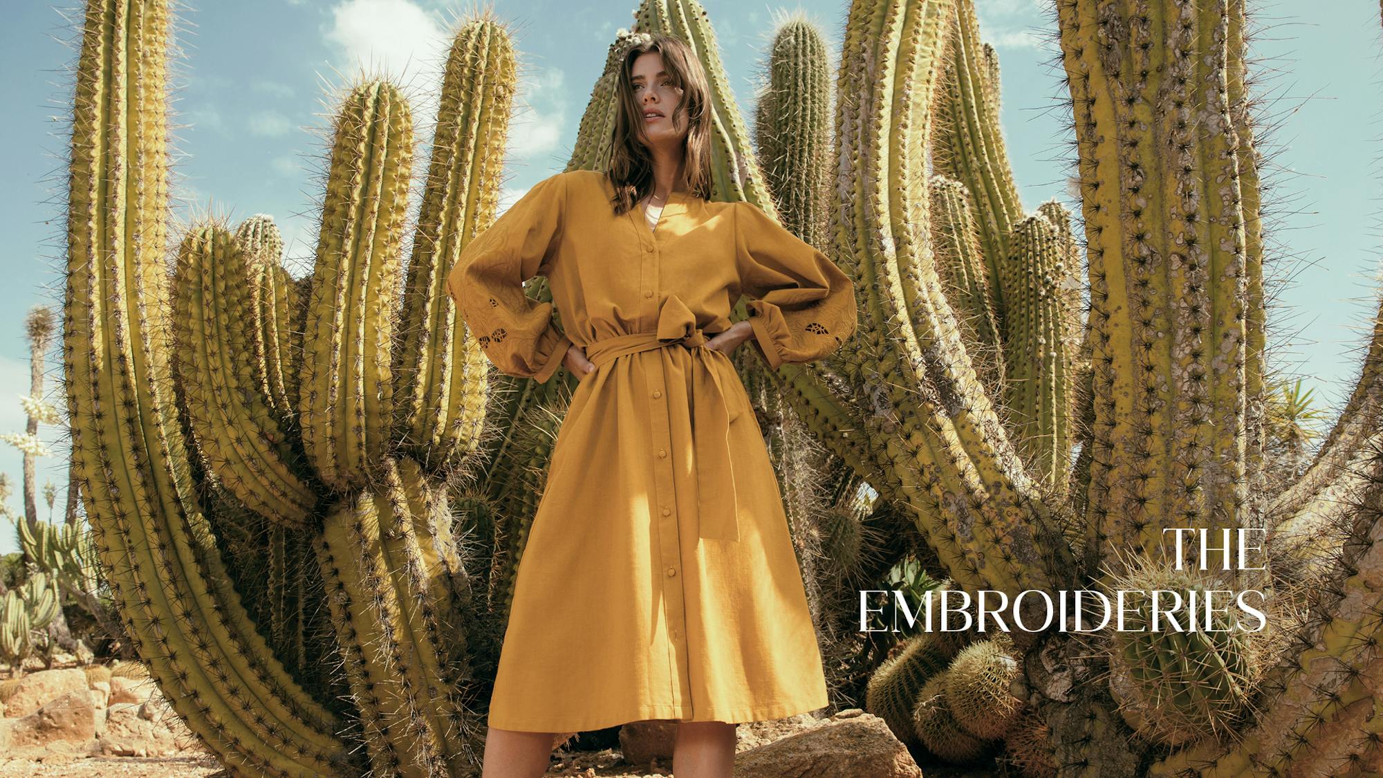 Dekorative Stickereien, ob grafisch oder verspielt, bilden den Schwerpunkt in diesem Programm. Styles mit luftigem Volumen, weit schwingende Kleider, Röcke und betonte Taillierungen stehen neben reduziert-minimalistischen Modellvarianten. Voiles, Cotton- und Leinenqualitäten bilden das Fundament der dekorativen Aussage.